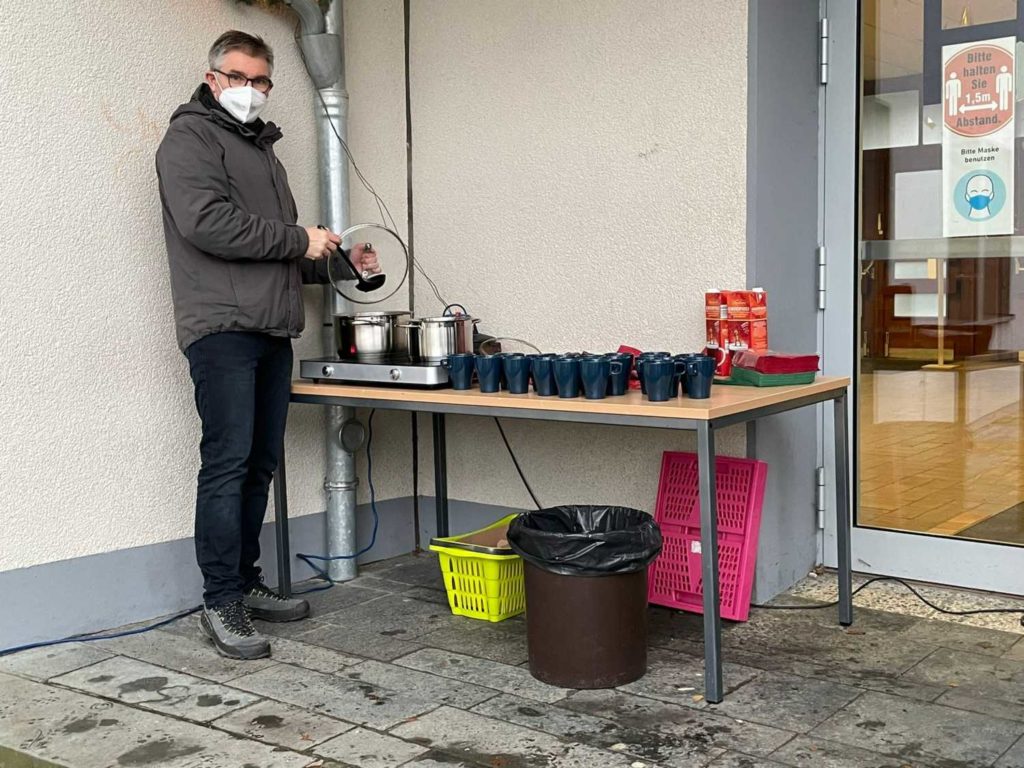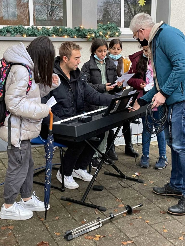 So lasen die Schüler*innen für alle Teilnehmenden vor, warum es sich – auch und gerade in diesen schwierigen Zeiten – lohnt, an Freude, Hoffnung, Liebe und Frieden festzuhalten. Dieser Gedanke wurde durch das gemeinsame Singen auf dem Schulhof bestärkt. Herr König am E-Piano und Herr Kuhmann an der Posaune unterstützten die Sänger*innen musikalisch. Gemütlich wurde noch zusammen Punsch getrunken und Kekse gegessen.