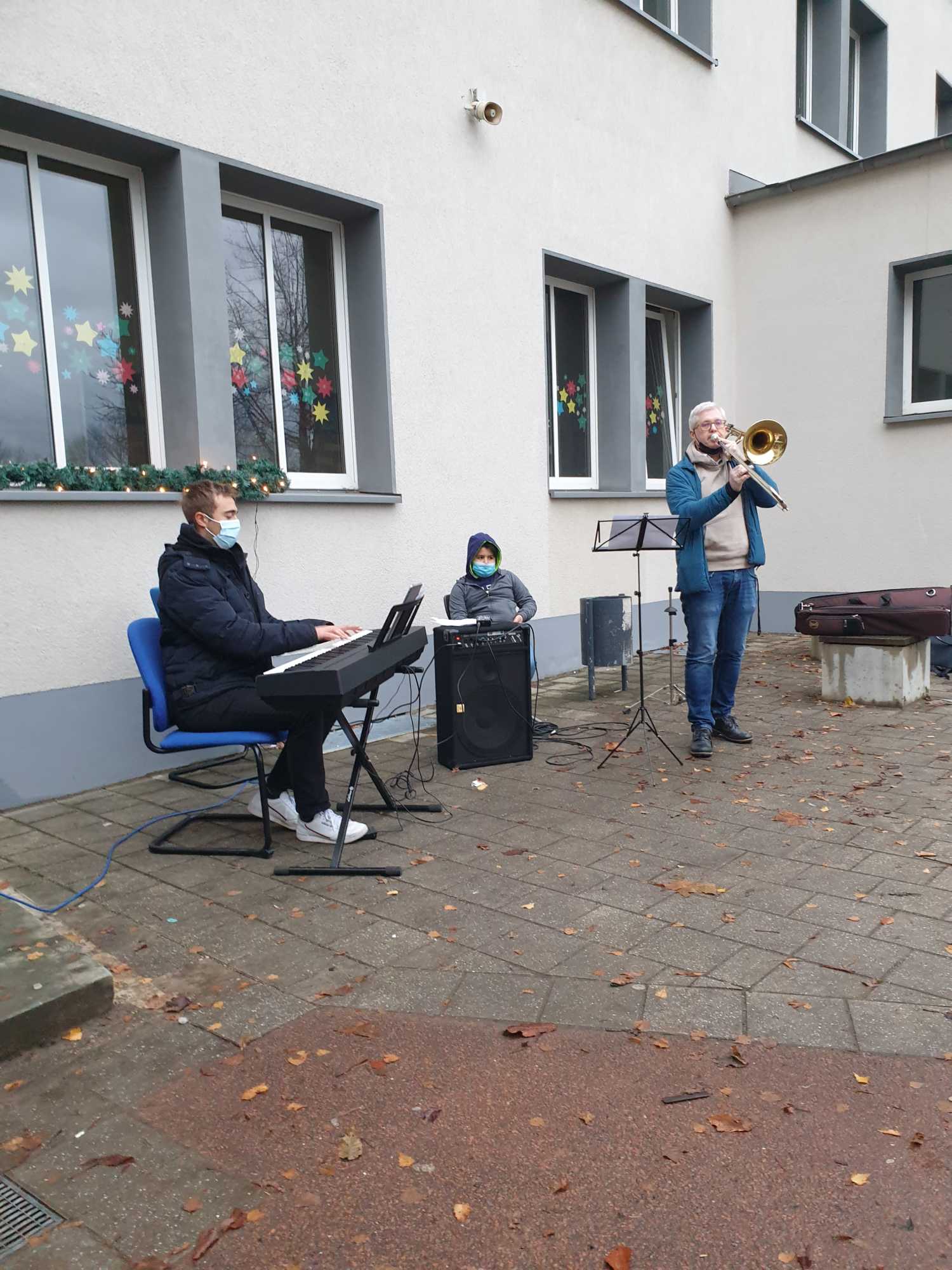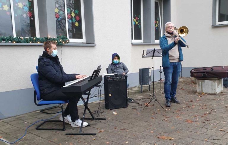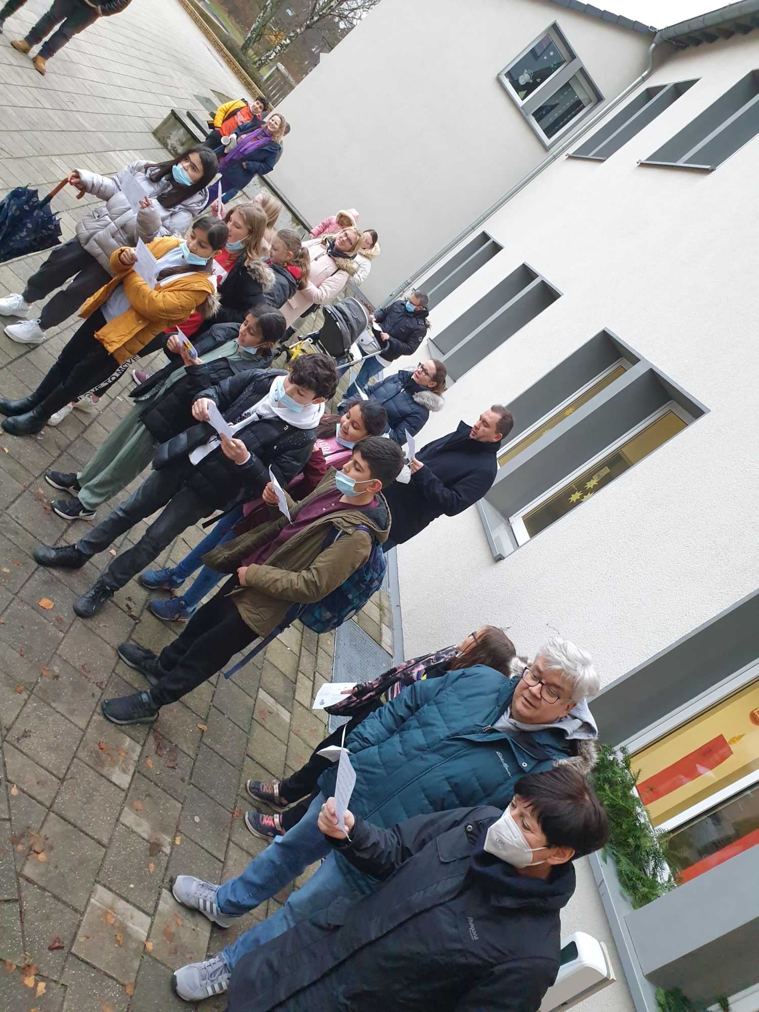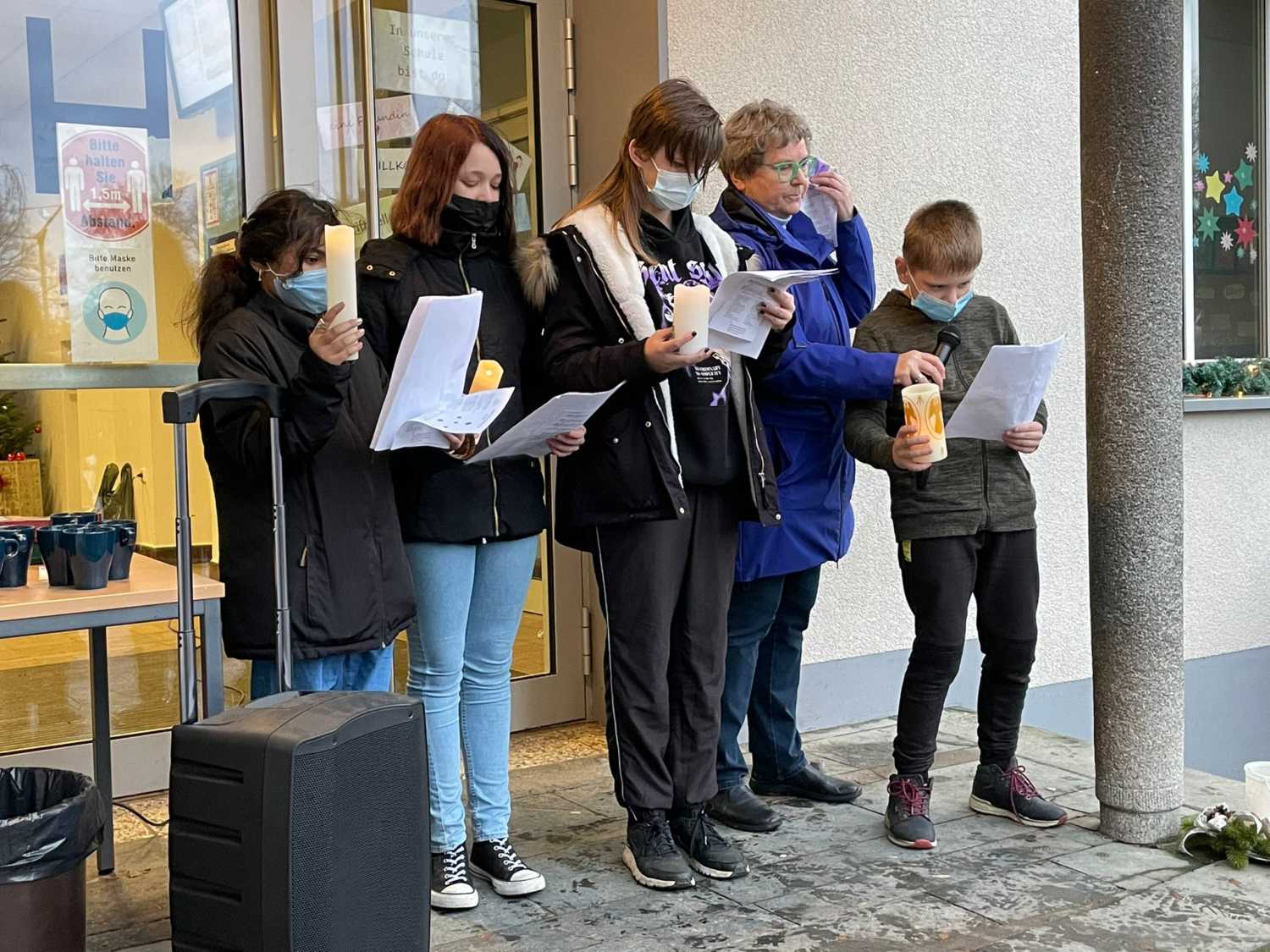 So lasen die Schüler*innen für alle Teilnehmenden vor, warum es sich – auch und gerade in diesen schwierigen Zeiten – lohnt, an Freude, Hoffnung, Liebe und Frieden festzuhalten. Dieser Gedanke wurde durch das gemeinsame Singen auf dem Schulhof bestärkt. Herr König am E-Piano und Herr Kuhmann an der Posaune unterstützten die Sänger*innen musikalisch. Gemütlich wurde noch zusammen Punsch getrunken und Kekse gegessen.