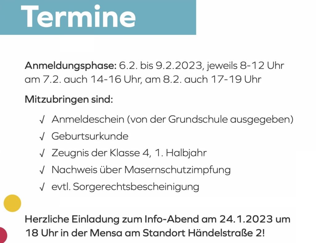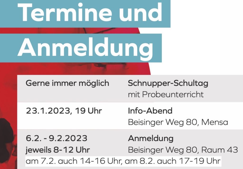 In der Zeit vom 16.01.2023 – 04.02.2022 haben die Eltern der künftigen Fünftklässler*innen wieder die Möglichkeit, sich für die Anmeldewoche vom 06.02. – 09.02.2023 einen persönlichen Gesprächstermin an der Schule zu reservieren.