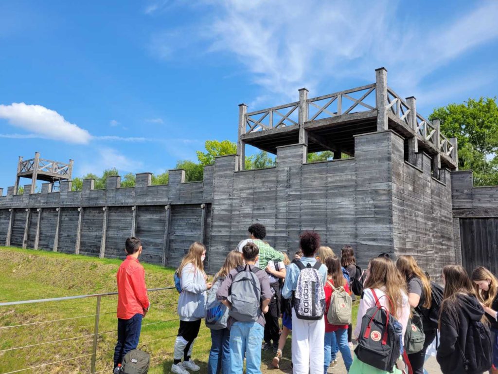 Bei Sonnenschein besichtigte die Lerngruppe dann im Außenbereich die nach neuesten wissenschaftlichen Erkenntnissen am Original-Ort wiedererrichteten Gräben, Mauern und Toranlagen. Es ist die größte derartige Rekonstruktion.