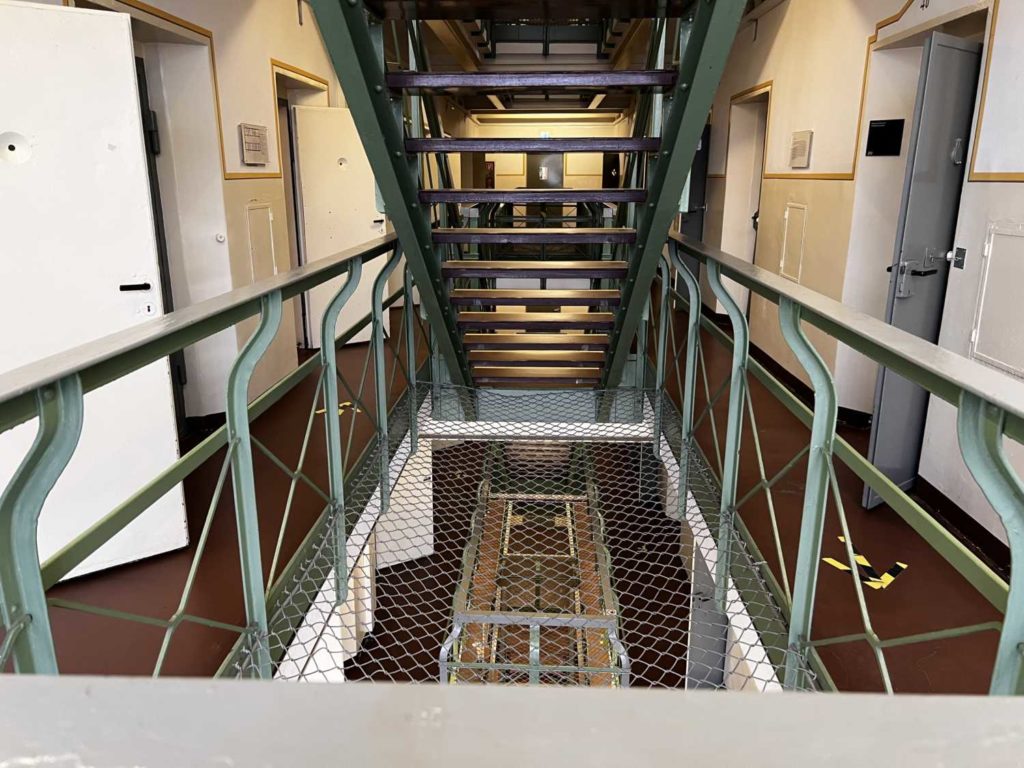 Beim Hineingehen konnten wir bereits erkennen, dass die Treppe, die drei Stockwerke miteinander verband, sich mittig im Gebäude befand. Die einzelnen Zellen waren um die Treppe herum angelegt. Die Einrichtung war nicht mehr komplett im Urzustand, wurde aber detailgetreu restauriert, sodass es sehr authentisch wirkte und die Vergangenheit gut veranschaulichte.
