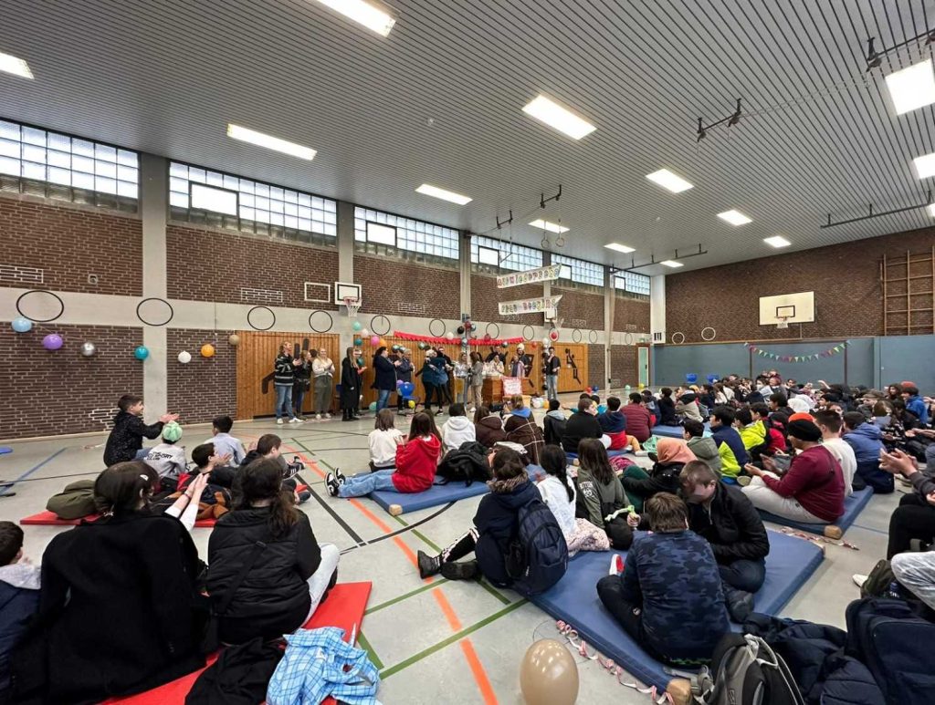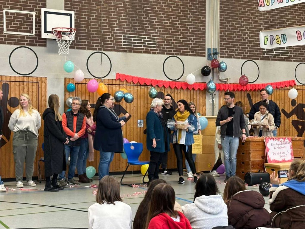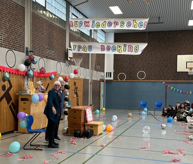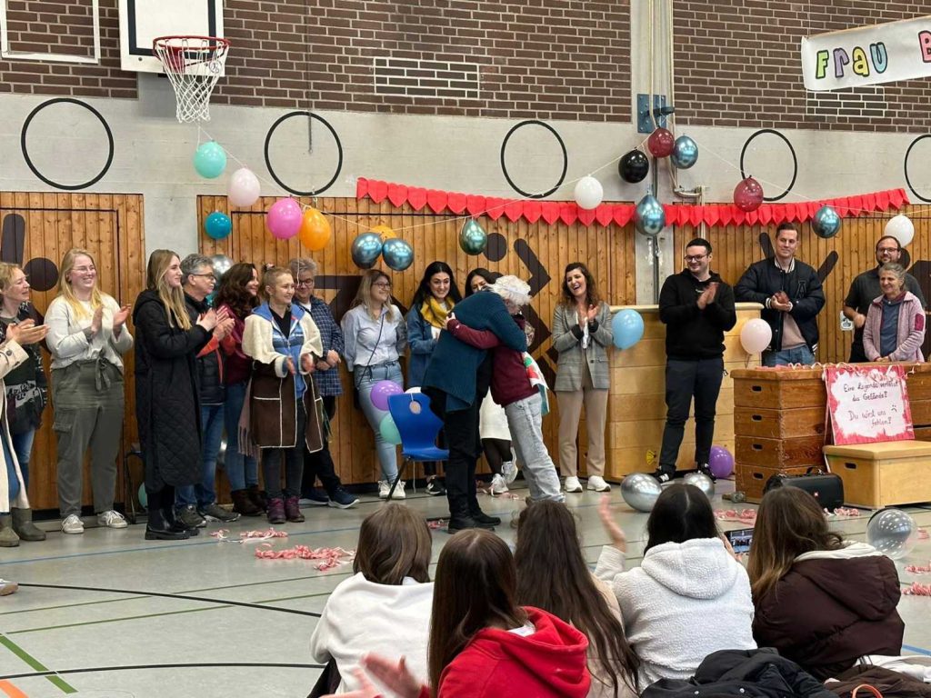 Durch ihr großes Engagement, ihren empathischen Umgang mit den Kindern und Jugendlichen und ihrer Hilfsbereitschaft bleibt sie vielen Schüler*innen nachhaltig im Gedächtnis. So antworteten Rahaf und Mujasara, zwei ehemalige Schülerinnen der Vorbereitungsklassen, am Donnerstagmorgen auf die Frage, was sie denn so früh an der Canisiusstraße machten: „Wir wollen uns von Frau Beeking verabschieden“. Gleiches taten später bei einem bunten und emotionalen Fest in der Sporthalle dann auch alle aktuellen Schüler*innen, unsere Schulleitung und viele Kolleg*nnen.