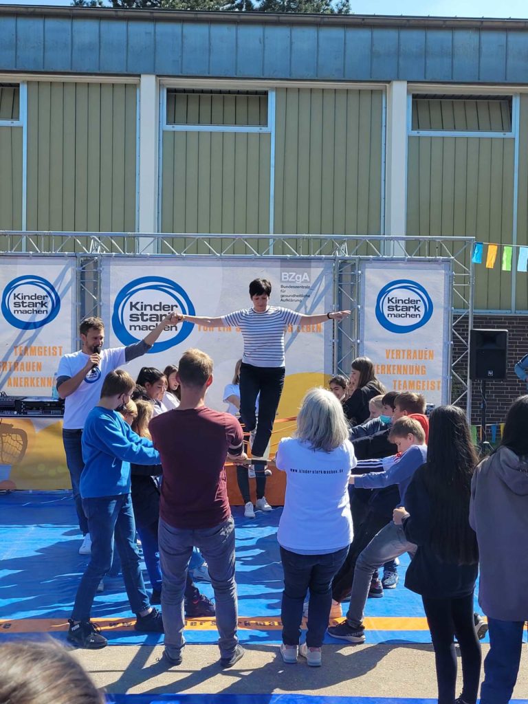 Beim Projekt „Kinder stark machen“ der Bundeszentrale für gesundheitliche Aufklärung (BZgA) konnten die Schülerinnen und Schüler des 5. und 6. Jahrgangs Einblicke in verschiedene Kooperations- und Wahrnehmungsspiele, Akrobatische Basisfiguren sowie Grundlagen zum „Helfen und Sichern“ gewinnen. Jede und jeder einzelne konnte so seine Fähigkeiten einbringen und zum verantwortlichen Teil der Gruppe werden.