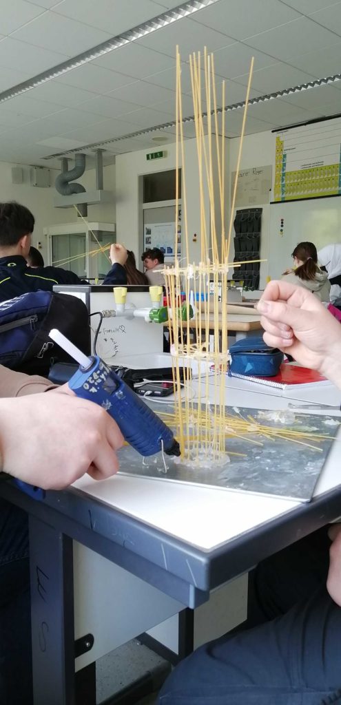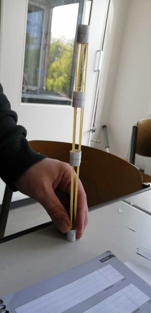 Unter der Aufgabe „Baue nach dem Prinzipien des Grashalms ein Hochhaus“ entstanden im WP-Unterricht Naturwissenschaften des 9. Jahrgangs unter der Leitung des Fachlehrers Herrn Klöcker Gebäude aus Spaghetti.