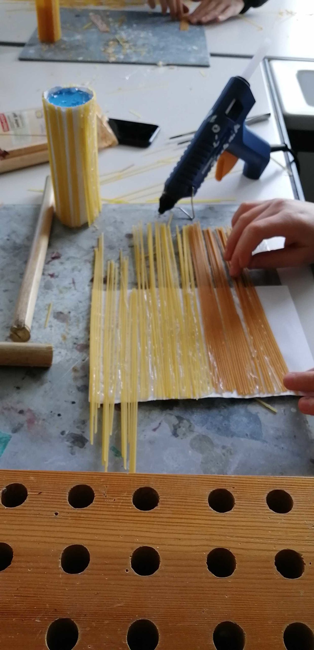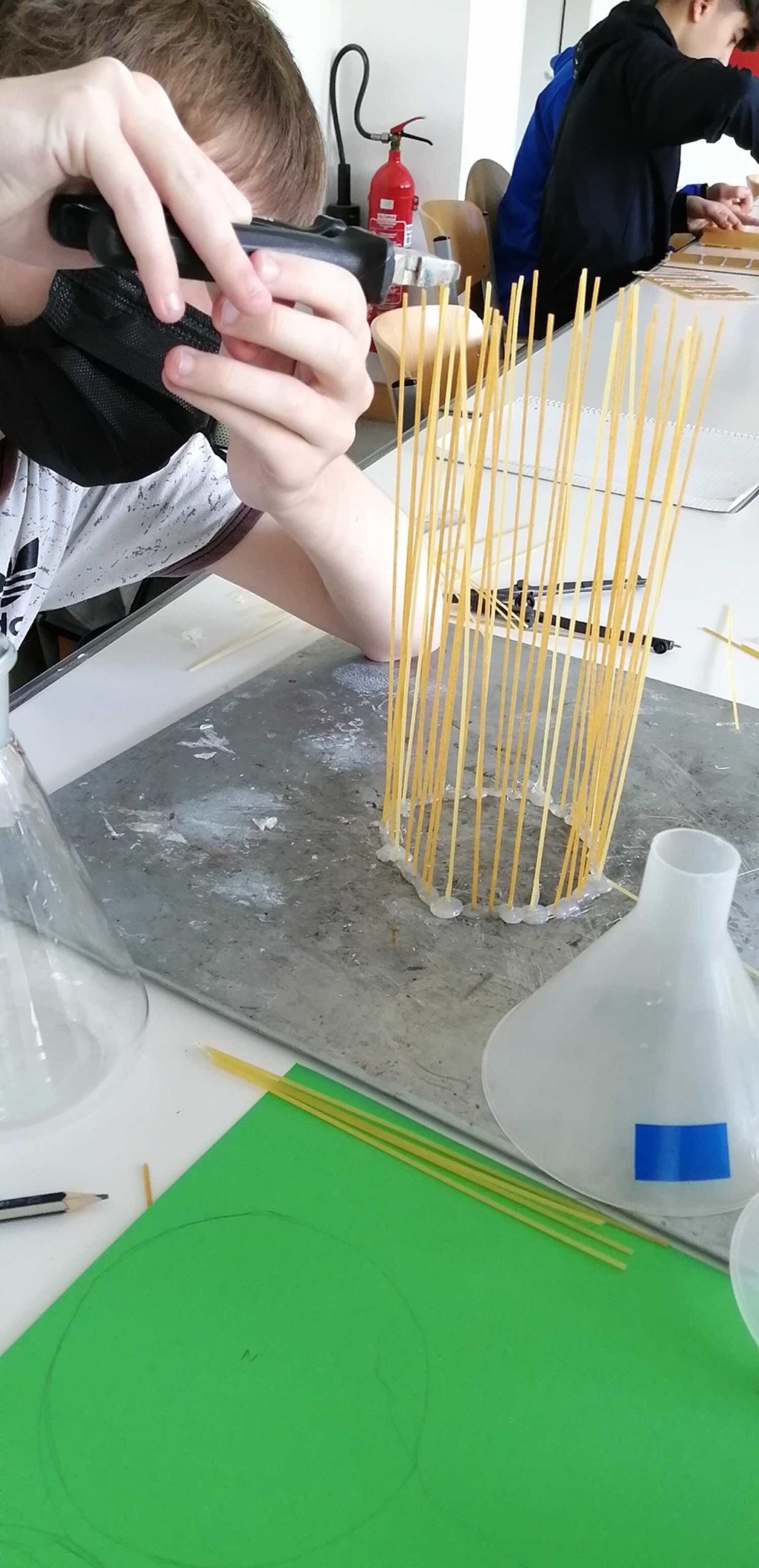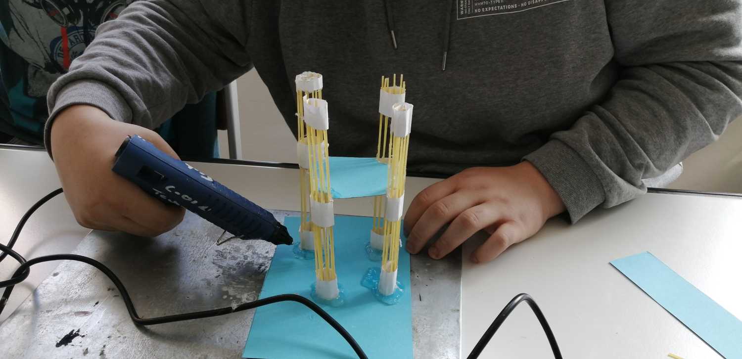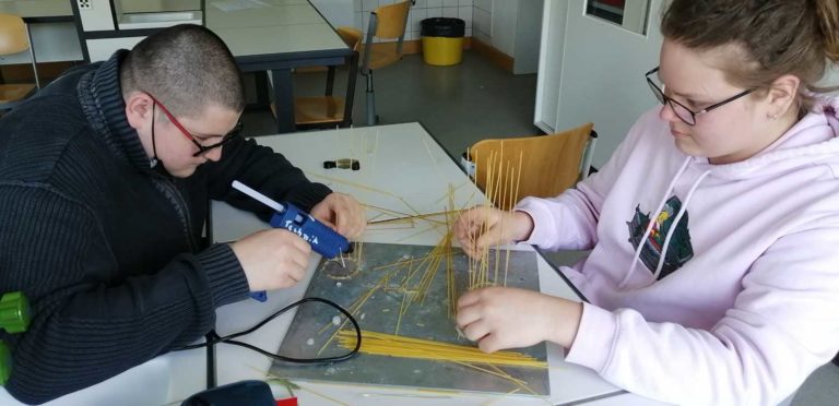 Unter der Aufgabe „Baue nach dem Prinzipien des Grashalms ein Hochhaus“ entstanden im WP-Unterricht Naturwissenschaften des 9. Jahrgangs unter der Leitung des Fachlehrers Herrn Klöcker Gebäude aus Spaghetti.