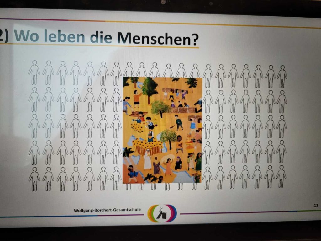 Die Fünftklässler*innen beschäftigten sich – wie auch in der Projektwoche – mit heldenhaftem Verhalten, das unsere Welt und ihre Bewohner einzigartig macht. Sie sollten dafür über eigene Träume und individuelles Verhalten nachdenken. Außerdem überlegten sie, wie sie heldenhafte, kleine, gute Taten gestalten können und formulierten dafür Komplimente. Bei der Station „Denk dir 100 Menschen“ lernten sie, wie unterschiedlich und ähnlich sich die Weltbevölkerung ist. Hierbei geht man davon aus, dass in einem Dorf 100 Menschen wohnen, die die Bewohner der Erde repräsentieren. Zur Unterstützung wurden die Ergebnisse „Unterschiede und Gemeinsamkeiten“ malerisch mit Hilfe von 100 Figuren festgehalten.