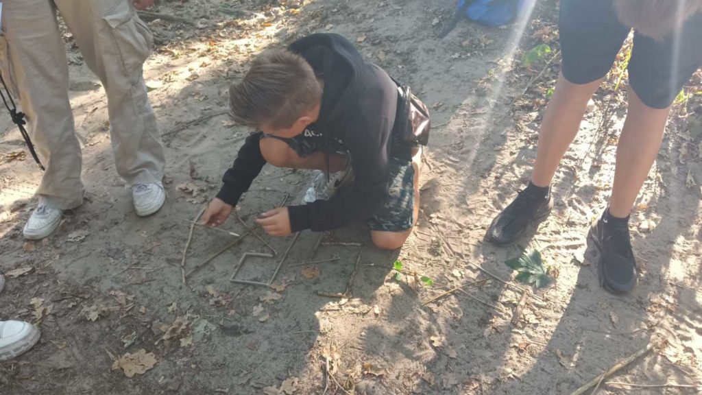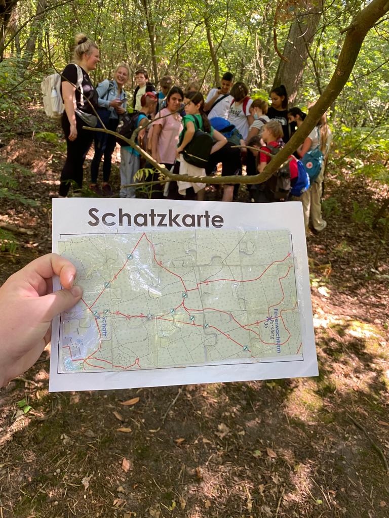 Die Kinder wurden klassenübergreifend gemischt und sammelten in den verschiedenen Gruppen Teile einer Schatzkarte. Es wurden Tipis gebaut, Bilder aus Naturmaterialien gelegt und Stöcker mit den Füßen geworfen. Die einzelnen Teile der Schatzkarte aus den Gruppen wurden zusammengefügt und ergaben die vollständige Schatzkarte.