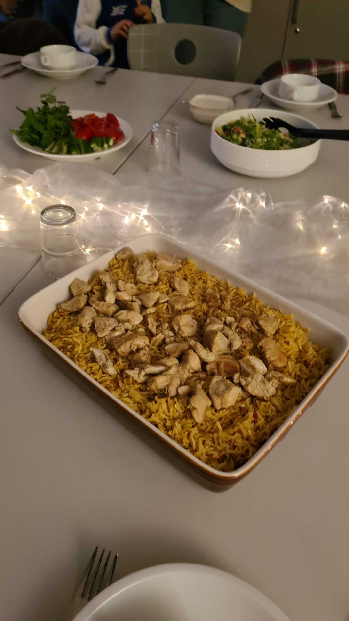 Der Tisch war reichlich gedeckt mit selbstgemachten Falafel, frischen Salaten und köstlichem Hähnchen mit Reis, der in Kohle gegart worden ist!