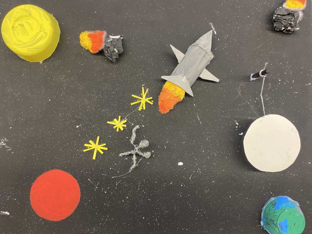 Es wurde viel geplant, geklebt, gemalt und gebastelt. Unterschiedliche Alltagsgegenstände wurden gesammelt und in ihrer Funktion umgedeutet. Beispielsweise wurden aus Eierkartons Häuser und aus Joghurtbechern kleine Planeten.
