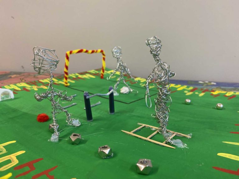 Die Sportklasse des 7. Jahrgangs, die Klasse 7.4, widmete sich auch im Kunstunterricht sportlichen Themen. In kleinen Gruppen entstanden im Laufe der letzten Wochen unterschiedliche dreidimensionale Parcours. Kleine Drahtfiguren bewegen sich über verschiedene Hindernisse. Sie hüpfen, klettern, rennen…