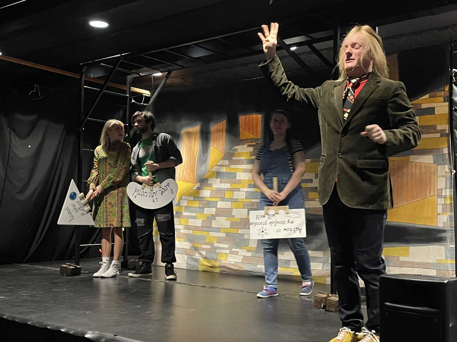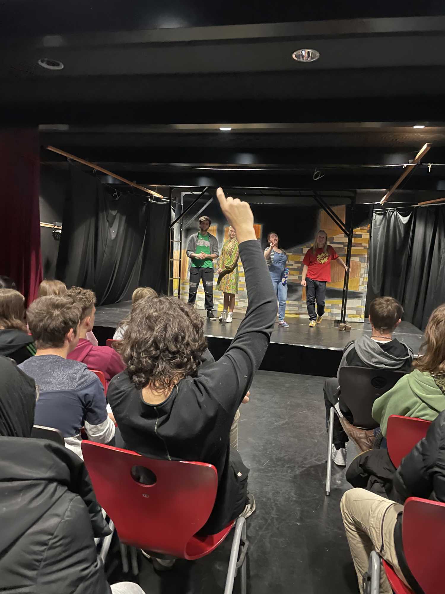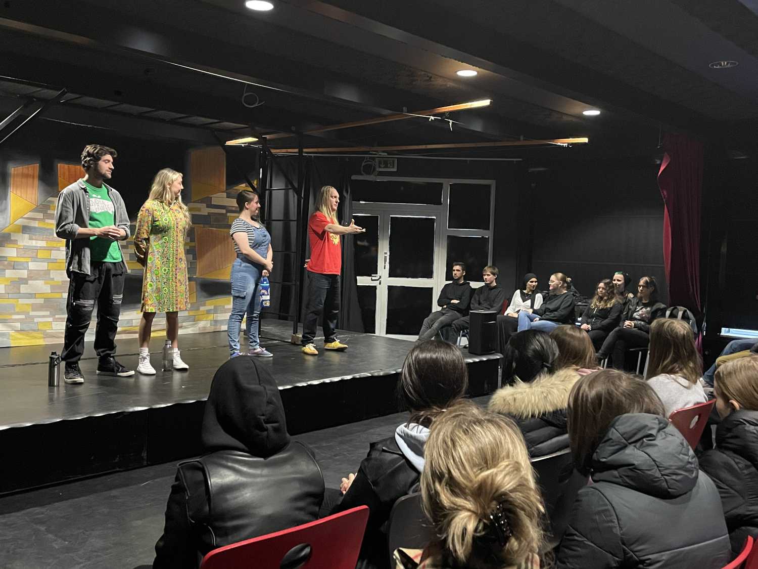Im Anschluss an die lebhaften Darbietungen, bei welchen die Akteur*innen teilweise bis zu vier verschiedene Rollen einnahmen, hatte das begeisterte Publikum die Gelegenheit, mit den sympathischen native speakers ins Gespräch zu kommen. So erzählten die Schauspieler*innen von ihren Erfahrungen im Theater, ihrer Herkunft und ihren deutschen Sprachkenntnissen.