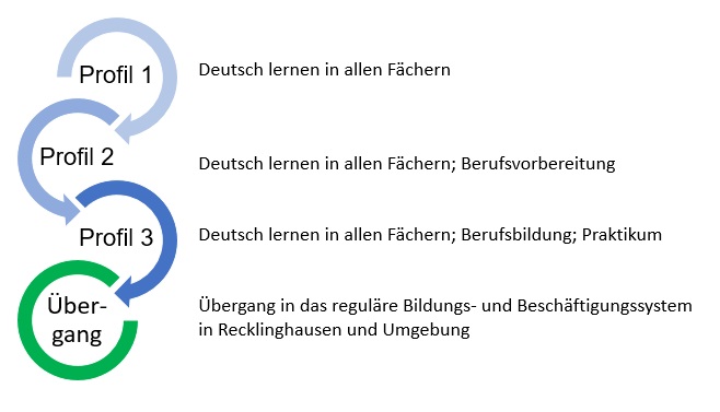 - einen möglichst schnellen Übergang in das reguläre Bildungs- und Beschäftigungssystem durch das dreistufige Profil